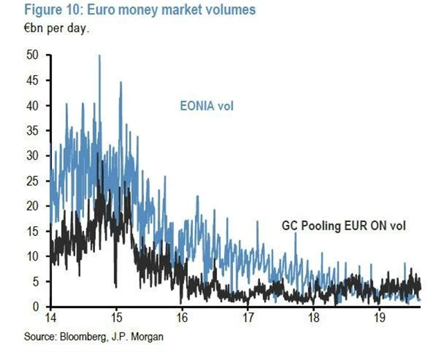 Záporné sazby v kombinaci s kvantitativním uvolňováním způsobily výrazné zpomalení aktivity na peněžním trhu. Objemy nezajištěných (EONIA) i zajištěných (GC Pooling EUR overnight index) transakcí na peněžním trhu se výrazně snížily na konci roku 2014, kdy ECB zavedla záporné sazby, a ještě více klesly po zahájení programu nákupu dluhopisů. Po ukončení odkupů (a velice aktuální otázka je, na jak dlouho QE skončilo) nedochází k výraznému navýšení objemů a další pokles sazeb by mohl situaci ještě zhoršit.