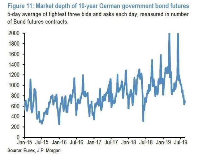 Podle JPMorgan může být negativními sazbami ovlivněn i trh s dluhopisy, protože nákup cenných papírů se zápornými sazbami nemusí být pro investory tak atraktivní (jakkoli to tak zatím nevypadá). Objemy na trhu s futures na desetileté německé státní dluhopisy letos prudce klesly. Výkyvy v objemech sice nebyly ani v minulosti nic mimořádného, ale hloubka posledního poklesu je alarmující.