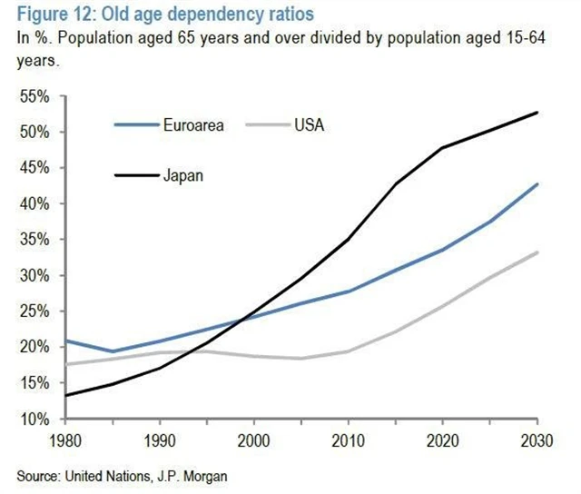 Nižší výnosy dluhopisů prohlubují deficity penzijních fondů a pojišťovacích společností. Zároveň je ale nutí omezovat investice do rizikových aktiv, jako jsou akcie. Tento trend je patrný zejména v zemích jako Japonsko, kde je demografický vývoj nejhorší.
