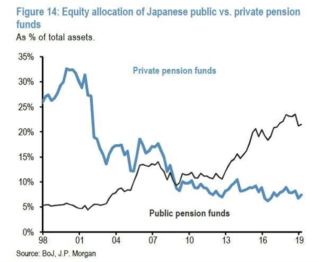 Stárnoucí populace obecně znamená, že se alokace aktiv posouvá k relativně bezpečnějším nástrojům, a proto japonské penzijní fondy drží, v porovnání například s americkými protějšky, velké množství dluhopisů. Zejména u privátních penzijních fondů došlo k redukci akciové složky výrazněji než u veřejných, což je trochu překvapivé.