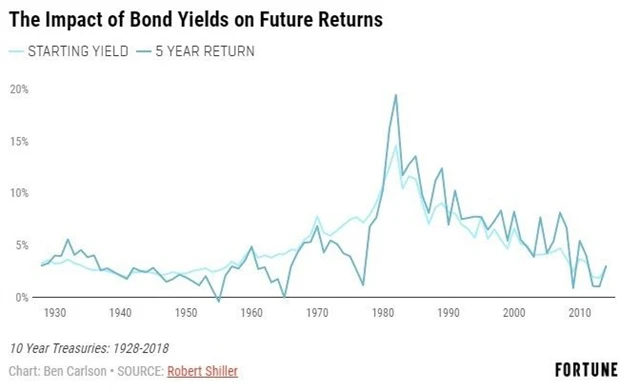 Vzhledem k tomu, jaké byly úroky na začátku období zobrazeného na grafu (výnos 10letých dluhopisů USA byl okolo 3 %), jsou zisky opravdu zajímavé. U dluhopisů (a dluhopisových fondů) je ale potřeba mít na paměti, že z dlouhodobého hlediska je výkonnost kvalitních cenných papírů s pevným výnosem dána počáteční úrokovou sazbou. Korelace budoucí výkonnosti téměř všech dlouhodobých splatností a jejich počátečního výnosu se pohybuje na úrovni 0,9-0,95, což znamená velice silnou pozitivní korelaci.