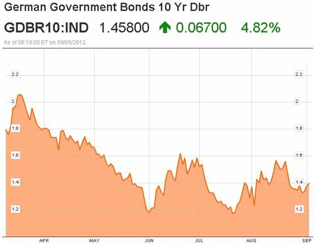 Německo, tradiční bezpečný dluhopisový přístav, ve středu doplatilo na všeobecně dobrou náladu na evropských burzách. Prodalo 10leté dluhopisy s výnosem 1,42 % (stejný jako v srpnové aukci), ovšem upsalo jich mnohem méně, než mělo v plánu. Na trhu si dnes země půjčila jen 3,61 miliardy eur místo plánovaných 5 miliard, poptávka nedosáhla ani 4 miliard. Česká republika na tom dnes byla ve své aukci mnohem lépe - celkem si půjčila 4 miliardy korun při vyšší poptávce.