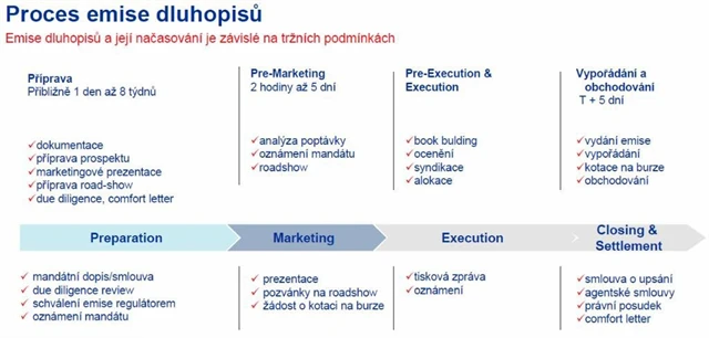 Všichni o nich mluví, všichni je řeší. Na jednu stranu vysoké výnosy vládních dluhopisů zemí evropské periferie, na druhé straně rekordně nízké výnosy dluhopisů zemí označovaných jako "bezpečné přístavy". K tomu si přimíchejte atraktivní firemní dluhopisy - a máme tady jedno z největších investičních témat současnosti. Jak vůbec taková emise dluhopisů probíhá a proč se jednotlivé subjekty rozhodují právě pro financování ve formě vydávání dluhopisů?