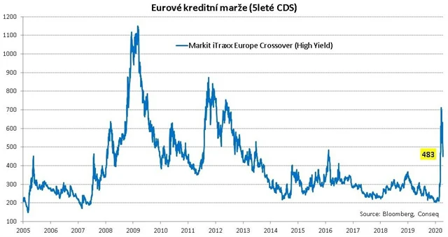 V případě korporátních dluhopisů s neinvestičním spekulativním ratingem (high yield) denominovaných v eurech dosáhly kreditní marže lokálního maxima 695 bazických bodů 23. března. V té době byl tedy stres na finančních trzích největší.