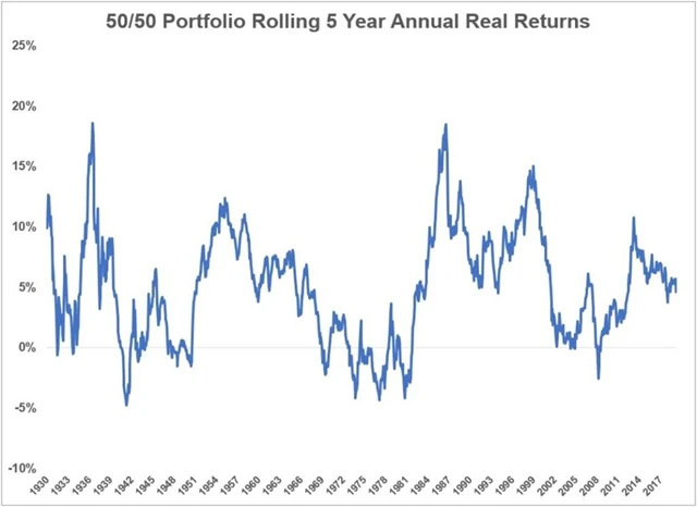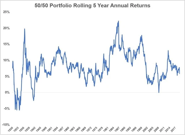 Jak ukazuje následující graf, portfolio složené z 50 % z amerických akcií a z 50 % z dluhopisů vykázalo od roku 1926 v pětiletém horizontu negativní roční výnos jen ve 4,4 % případů. Naposledy se tak stalo během finanční krize, kdy na konci února 2009 dosahoval průměrný roční výnos -0,02 %.