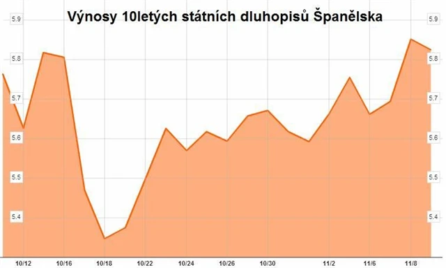 Graf někdy řekne více než tisíc slov. Výnosy španělských vládních dluhopisů od 18. října stabilně rostou. Sice nejde o dramatické úrovně, výnosy jsou stále pod 6 %, nicméně zdráhavý postoj Rajoyovy vlády k žádosti o pomoc z ESM, navíc podporovaný výroky německých a dalších evropských politiků, dělá z příslibu odkupu dluhopisů ze strany ECB (program OMT) jen bezpečnostní záklopku, o kterou ale nikdo aktuálně nestojí.