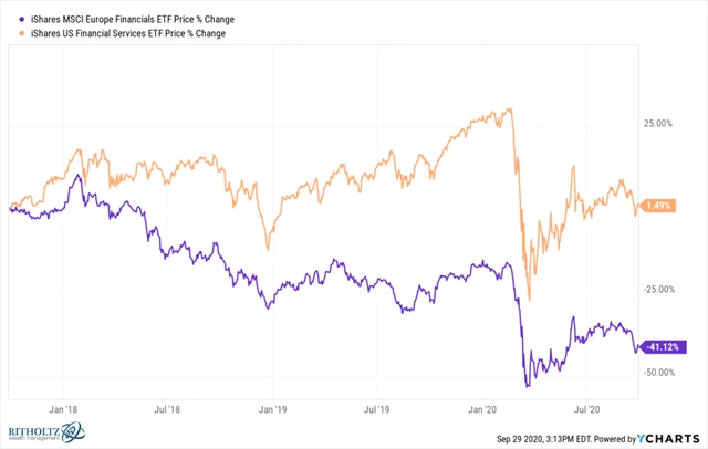 Nejprve se podívejme na graf vývoje cen akcií bank v Evropě a v USA. V obou případech je to celkem tristní pohled, je ale patrné, že banky na starém kontinentu jsou tom o poznání hůře. A byť to nemusí být důvod jediný, roli jistě hraje o to, že Evropská centrální banka zavedla záporné úrokové sazby.