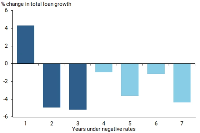 "Období záporných úroků centrální banky vede k poklesu ziskovosti a nakonec i aktivity v bankovním sektoru," uvádí se v materiálu. "První rok po zavedení negativních sazeb se bankám daří lépe, objem úvěrů roste, během dalších dvou let ale propady smažou veškeré zlepšení."