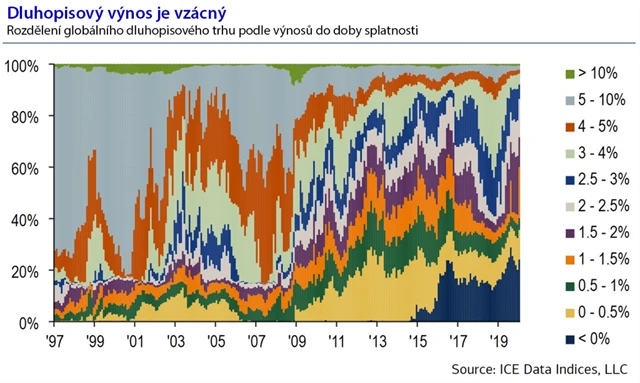 Z globálního hlediska se kladný (reálný) výnos do splatnosti stává stále vzácnějším zbožím. Přibližně pětina všech dluhopisů nabízí záporný nominální výnos do doby splatnosti. To znamená, že pokud investoři drží tyto bondy až do splatnosti, s jistotou zaznamenají ztrátu hodnoty investovaných peněz.