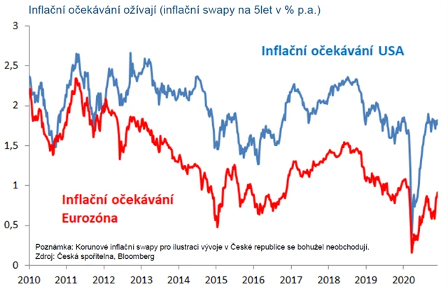 Podobný vývoj sledujeme i na hlavních trzích, kde se benchmarková 10letá dolarová sazba drží pod 1 %, ale inflační očekávání na trhu rostou. Inflační swapy, které úrokové sazby většinou předbíhají, rostou v USA a dokonce i v eurozóně. Větší pohyb v tržních úrokových sazbách může přijít, až se ukážou úspěchy v zápolení s epidemií a ekonomika ožije.