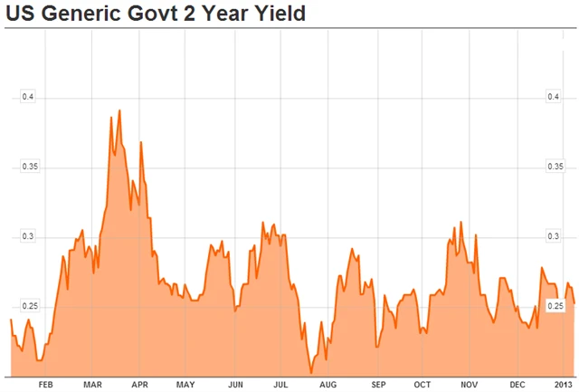 Spojené státy americké prodaly v úterý státní dluhopisy za 32 miliard USD s výnosem 0,385 % při poměru mezi poptávkou a nabídkou 3,62. Aukce potvrdila, že blížící se jednání o navýšení stropu zadlužení, které přímo hrozí možností technického defaultu země, nemá podobně jako předchozí jednání o řešení rozpočtového útesu vliv na apetit trhu po amerických státních dluhopisech.