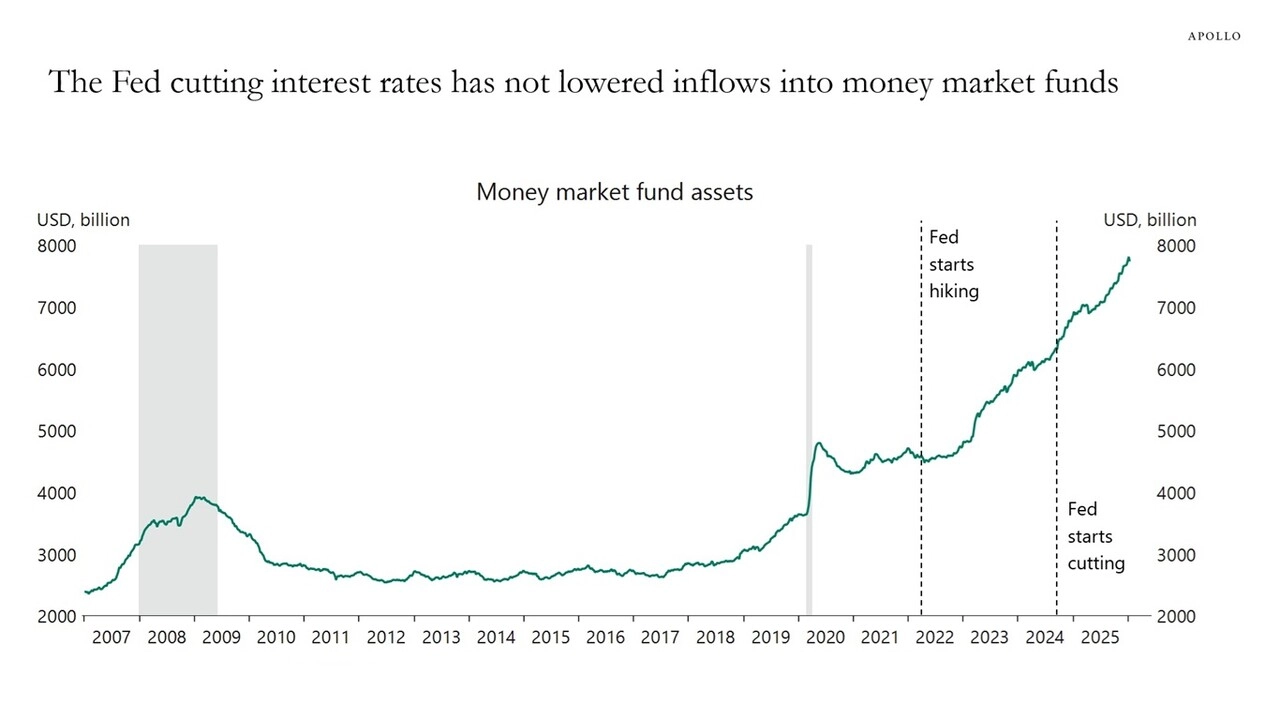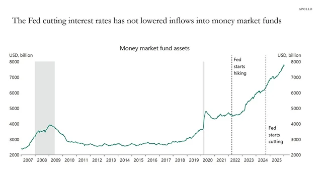 - Snižování sazeb Fedu nevedlo ke zpomalení přílivu prostředků do fondů peněžního trhu. To naznačuje, že tyto "peníze stojící stranou" nejsou na úrokové sazby tak citlivé, jak se většinou uvažuje.
