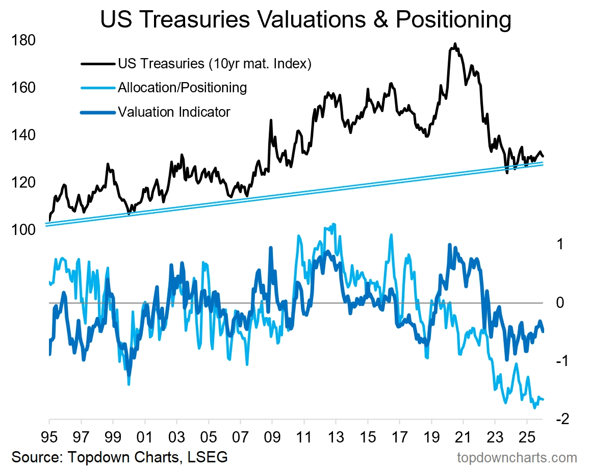 Nechuť části investorů nakupovat americký dluh je proto celkem pochopitelná a také poměrně rozšířená. To je na jednu stranu jistě důvod k zamyšlení, jestli to trh s těmi obavami trochu nepřehání. "Když se ocitnete na straně většiny, měli byste se zastavit a přemýšlet, řekl kdysi Mark Twain. Objektivně a čistě kvantitativně jsou totiž dlouhodobé americké státní dluhopisy levné (nízké valuace), nálada vůči nim až extrémně pesimistická a pozice na trhu silně vychýlené proti nim. Zároveň se zdá, že technická podpora jejich cen zatím drží," říká Callum Thoms z TOPDOWN CHARTS.