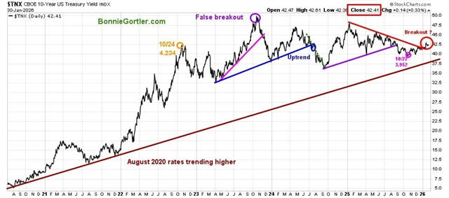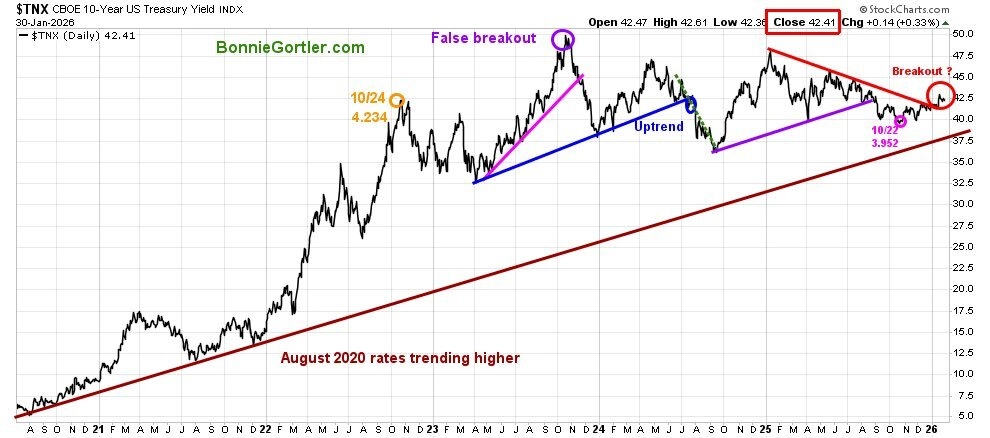 Na trhu s americkými vládními dluhopisy je zatím celkem klid. Mluvili jsme o tom nedávno s Tomášem Pfeilerem ze společnosti CYRRUS. Jedna věc je krátkodobá nervozita, druhá případný dlouhodobý tlak na vyšší výnosy amerických bondů. Ale jestli investujete a zajímáte se o trhy častěji než jednou za rok na schůzce s finančním poradcem, graf výnosů 10letých státních dluhopisů USA byste měli mít na svém dashboardu. Za Trumpa 2.0 i po jeho konci.