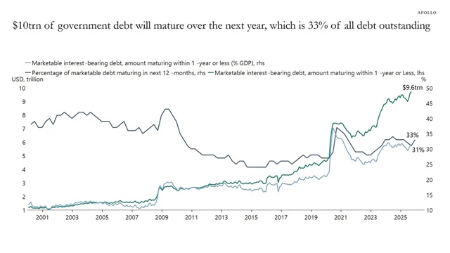 Vládní bondy USA každopádně v současnosti nejsou zrovna oblíbené, minimálně ve srovnání se situací běžnou před deseti lety. Ekonom Torsten Sløk z Apollo Global Management upozorňuje, že v následujících 12 měsících je splatný americký státní dluh v objemu zhruba 10 bilionů dolarů. Amerika bude tedy tento objem (a další na schodek rozpočtu a obsluhu dluhu, tedy úroky) potřebovat prodat na trhu, aby se mohla dále financovat. Sløk shrnuje, co je v současnosti potřeba vědět o poptávce po amerických dluhopisech: