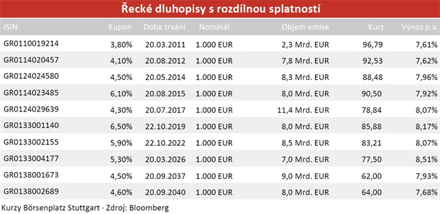 Za atraktivní považujeme řecký papír, který je splatný v srpnu 2012, aktuálně kotuje okolo 82 procent a nabízí výnos zhruba 7,6 % p.a., pokud bude vše řádně splaceno. I při 10procentním haircutu, by při splacení za 90 procent došlo k minimální ztrátě. U dlouhodobých splatností výnosy klesají, protože investoři sázejí na to, že aktuální problémy budou již dávno historií a situace se vrátí do normálu. Papír se splatností v roce 2040 tak nabízí "pouze" 7,7 procenta p.a., což je jen o necelých pět procentních bodů více, než by investoři momentálně utržili na německých státních dluhopisech s tak dlouhou splatností.