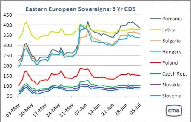 Zdá se, že CDS, tedy cena, která se platí za zajištění pro případ nesplácení dluhu, na východoevropské dluhopisy se poněkud zklidnily. Po složitém období ze začátku června se vývoj jejich ceny srovnal. Přesto ceny maďarských, rumunských, lotyšských a bulharských CDS stále dosahují vysokých hodnot. Nás může těšit velice klidný vývoj CDS České republiky.