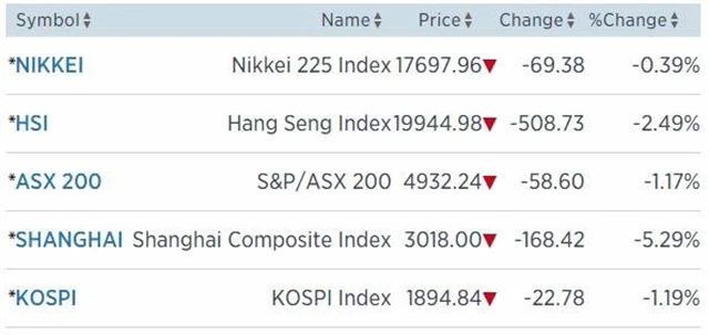 Index CSI300, který zahrnuje největší firmy registrované na burzách v Šanghaji a Šen-čenu, klesl o 5,03 % na 3192,45 bodu. Index burzy v Šanghaji pak oslabil o 5,3 %.