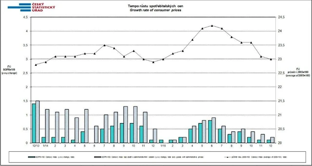 Meziročně vzrostly spotřebitelské ceny v prosinci stejně jako v listopadu o 0,1 %. Vývoj cen v prosinci ovlivnilo především prohloubení cenového poklesu v oddíle potraviny a nealkoholické nápoje a naopak zmírnění poklesu cen v oddíle doprava. V oddíle potraviny a nealkoholické nápoje v prosinci klesly ceny pekárenských výrobků a obilovin o 1,2 % (v listopadu o 0,9 %), jogurtů o 11,9 % (v listopadu o 5,7 %), másla o 9,0 % (v listopadu o 7,5 %), jedlých olejů o 5,9 % (v listopadu o 3,2 %), nealkoholických nápojů o 4,3 % (v listopadu o 2,8 %). Snižující vliv mělo i zpomalení růstu cen některých potravin. Ceny ovoce byly v prosinci vyšší o 1,3 % (v listopadu o 8,7 %), zeleniny o 12,7 % (v listopadu o 17,0 %), těstovin o 3,6 % (v listopadu o 6,8 %), rýže o 1,1 % (v listopadu o 2,7 %), ryb o 2,6 % (v listopadu o 3,5 %). V oddíle doprava došlo ke zmírnění cenového poklesu zejména vlivem cen pohonných hmot, které byly v prosinci nižší o 15,1 % (v listopadu o 17,6 %). V oddíle ostatní zboží a služby zpomalil růst cen zejména vlivem přechodu cen osobní péče z růstu o 0,6 % v listopadu v pokles o 0,4 % v prosinci.