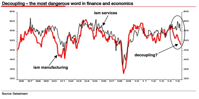 Když americká ekonomika směřuje do recese, téměř vždy jde o zpracovatelský sektor, který s sebou stáhne méně volatilní sektor služeb a nakonec celou ekonomiku.