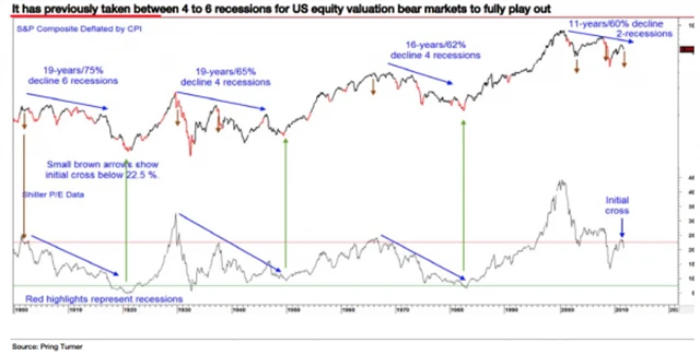 Centrální banky využily všechny své nástroje pro zvýšení cen aktiv. Kapitálové trhy jsou proto nyní předurčeny k dramatickému propadu, pokud skutečně přijde recese. Akcie budou ohodnoceny podle Shillerova P/E poměru na 7násobek zisků, tedy zmiňovaných 550 bodů.