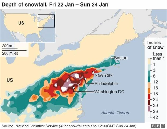 V newyorském Central Parku bylo naměřeno 68 centimetrů sněhu, což je druhá nejvyšší hodnota v historii, napsala BBC. V únoru 2006 bylo na témže místě naměřeno podle oficiálních údajů 68,3 centimetru sněhu. "Tohle bude jedna z těch generačních událostí, o kterých vám budou rodiče vyprávět, jak moc špatné to bylo," řekl podle BBC meteorolog Ryan Maue z WeatherBell Analytics. Celkově blizard zasáhl kolem 80 milionů lidí ve 20 státech.