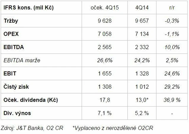 "Předpokládáme, že se společnosti podaří naplnit celoroční výhled zisku EBITDA 9,9-10,2 miliardy Kč, přičemž kvůli nákladům na marketing O2 TV čekáme čísla mírně pod střední hodnotou tohoto pásma. Zisk EBITDA by ale i tak měl vykázat 8% růst díky zrušení manažerských odměn pro PPF a úsporným opatřením. EBITDA marže by měla být mírně pod čísly za předchozí čtvrtletí. Čistý zisk společnosti za celý rok 2015 by měl být v souladu s výhledem O2 4,85-5,2 miliardy Kč. Čistý zisk za samotné čtvrté čtvrtletí by měl být 1,23 miliardy Kč," pokračuje analytik.