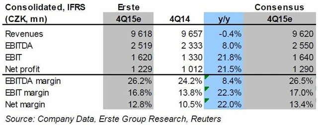 "Více než na samotná čísla se ovšem zřejmě investoři zaměří na návrh hrubé dividendy. Náš odhad 17,80 Kč na akcii je lehce nad odhadem trhu 16,10 Kč na akcii (6,4% hrubý dividendový výnos). Vedle dividendy by mohl management firmy představit i výhled na rok 2016. Zde prozatím očekáváme 1,5% nárůst zisku EBITDA," dodává Vaníček.
