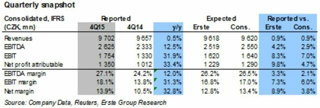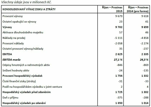 Čistý zisk se firmě v posledních třech měsících loňského roku meziročně zvýšil o 336 milionů korun, v posledním čtvrtletí předloňského roku činil 1,014 miliardy korun. Výnosy pak na 9,7 miliardy korun stouply z 9,66 miliardy korun ve 4Q2014.