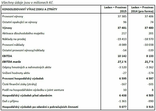 Za celý rok 2015 se tržby společnosti ve srovnání s předchozím rokem prakticky nezměnily, když dosáhly 37,481 miliardy korun, zatímco o rok dříve byly 37,48 miliardy korun.