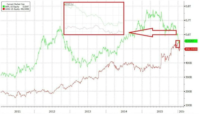 Mezi březnem 2013 a květnem 2015 vyskočila cena akcií Applu o více než 120 %, což vyhnalo jeho tržní kapitalizaci až nad 760 miliard dolarů a zajistilo mu titul největší veřejně obchodované společnosti. Od té doby se ale cena akcií Applu sesunula zhruba o čtvrtinu a prvenství podniku v žebříčku firem podle "market cap" se začalo otřásat.
