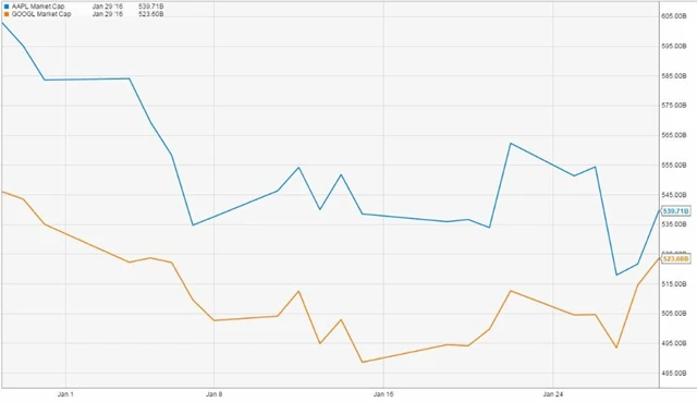 Na začátku ledna, kdy se křivky tržních kapitalizací Alphabetu a Applu nejvíce přiblížily, byl rozdíl mezi nimi jen 25,17 miliardy dolarů. Poté se křivky opět mírně rozešly, rozdíl mezi nimi ale i tak zůstal zanedbatelný.