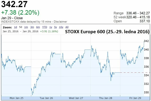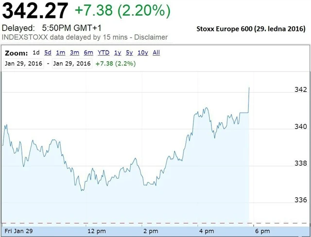 Britský FTSE 100 zpevnil o 2,56 %, francouzský CAC 40 o 2,19 % a německý DAX o 1,64 %. Regionální STOXX Europe 600 přidal 2,2 % na 342,27 bodu a panevropský index FTSEurofirst 300 si připsal 2,3 % a uzavřel na 1 348,08 bodu, za celý měsíc však ztratil přes šest procent, což představuje nejprudší lednový pokles od roku 2008.