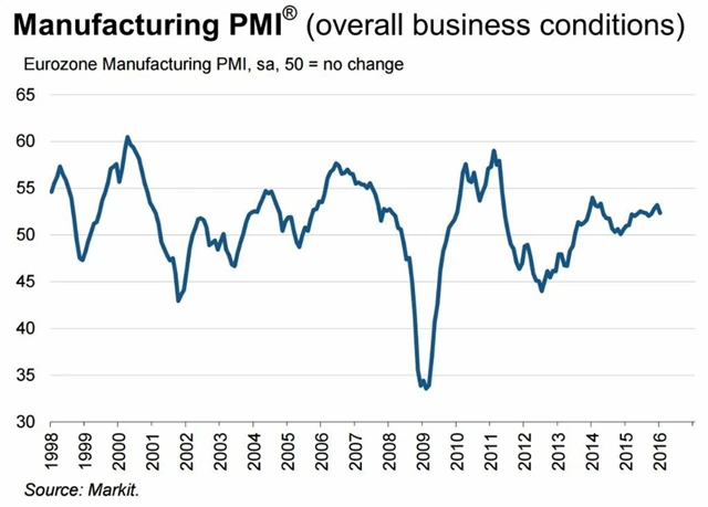 Eurozóna: Index nákupních manažerů ve zpracovatelském průmyslu za leden 52,3 bodu (odhad: 52,3 bodu, flash: 52,3 bodu, prosinec: 53,2 bodu)