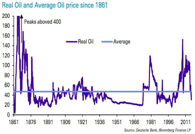 Jim Reid, stratég z německého finančního ústavu Deutsche Bank, upozorňuje, že pokud se podíváme na dlouhodobý průměr cen ropy vyjádřený v dnešních penězích, nejsou současné hodnoty zase tak katastrofické.