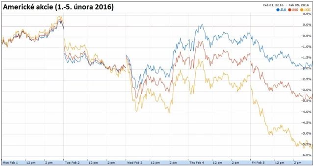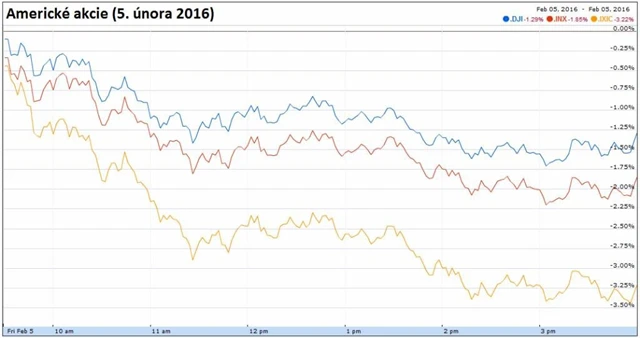 Dow nakonec ztratil 1,29 % na 16 204,97 bodu, širší S&P 500 klesl o 1,85 % na 1 880,05 bodu a Nasdaq Composite spadl o 3,25 % na 4 363,14 bodu, nejnižší úroveň od října 2014. Index volatility VIX vyskočil o 7,05 % na 23,38 bodu a výnos 10letých vládních dluhopisů USA se večer bez výraznější změny pohyboval kolem 1,844 %.