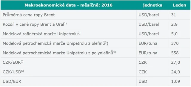 Modelové marže petrochemické společnosti Unipetrol se v lednu zvýšily. Rafinérská marže se meziročně zvýšila na 5 USD na barel z 4,50 USD na barel, petrochemická marže z olefinů stoupla na 370 eur na tunu z 362 eur na tunu a petrochemická marže z polyolefinů vzrostla na 558 eur na tunu z 311 eur na tunu. Rozdíl v ceně ropy Brent a Ural stoupl meziročně na 2,90 USD z 1,80 USD na barel.