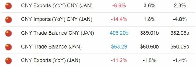 Aktivita Číny v mezinárodním obchodu v lednu výrazně klesla. Dovoz (počítáno v jüanech) spadl meziročně o 14,4 % a vývoz o 6,6 %. V obou případech byl propad hlubší, než čekali analytici.