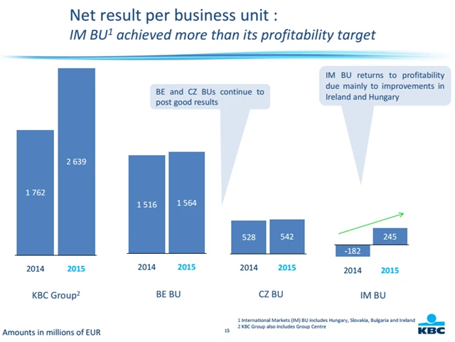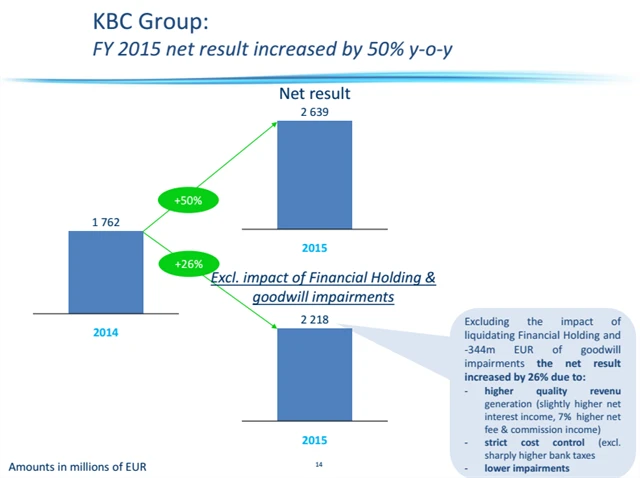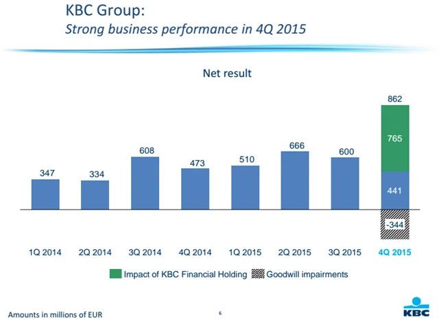 V samotném čtvrtém čtvrtletí čistý zisk skupiny KBC v meziročním srovnání stoupl o více než 80 % na 862 milionů eur. Analytici však počítali s ještě výraznějším nárůstem, a to o 160 % na 1,228 miliardy eur.