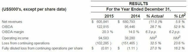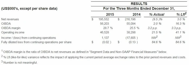 Zisk OIBDA (provozní zisk před zahrnutím finančních nákladů, daní, odpisů a amortizace) se firmě zvýšil při vyloučení vlivu kurzových změn meziročně o 16 % na 56,2 milionu USD a OIBDA marže vzrostla na 28,7 % z 25,5 % ve 4Q2014.