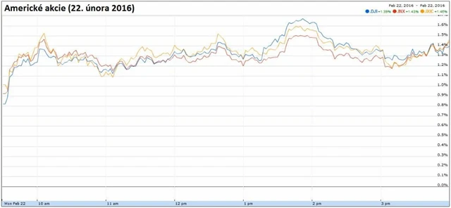 Dow přidal 1,4 % na 16 620,66 bodu, širší S&P 500 vzrostl o 1,45 % na 1 945,50 bodu a Nasdaq Composite zpevnil o 1,47 % na 4 570,61 bodu. Index volatility VIX klesl o 5,6 % na 19,38 bodu a výnos 10letých vládních dluhopisů USA se zvýšil o jeden bazický bod na 1,759 %.