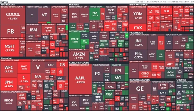 Index Dow odepsal 1,14 % a uzavřel na 16 431,78 bodu, S&P 500 odepsal 1,25 % na 1 921,27 bodu a Nasdaq Composite spadl o 1,47 % na 4 503,58 bodu. Ztrácely tituly ve všech deseti hlavních sektorech, nejvíce energetika a základní materiály, dále mpak technologie a finance. Relativně nejlépe dopadly akcie v odvětvích jako spotřební zboží a veřejné služby. Index volatility VIX stoupl o 8,26 % na 20,98 bodu a výnos 10letých vládních dluhopisů USA klesl o více než tři bazické body na 1,7191 %.