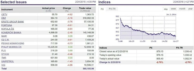 K propadu celé burzy přispělo hlavně oslabení akcií energetické firmy ČEZ, které zaznamenaly největší objem obchodů z hlavních emisí a odepsaly 3,16 % na 364,10 Kč. Také bankovní emise ztrácely - cenné papíry skupiny Erste zlevnily o 3,76 % na 652,60 Kč a akcie Komerční banky o 2,45 % na 4 698 korun.