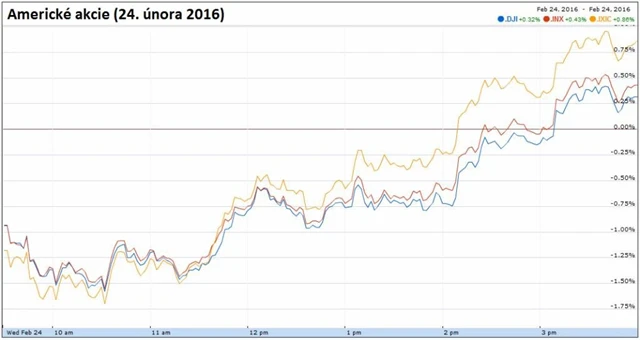 Dow nakonec přidal 0,32 % na 16 484,99 bodu, širší S&P 500 posílil o 0,44 % na 1 929,80 bodu a Nasdaq Composite zpevnil o 0,87 % na 4 542,61 bodu. Index volatility VIX klesl o 1,24 % na 20,72 bodu a výnos 10letých vládních dluhopisů USA se zvýšil o dva bazické body na 1,743 %.