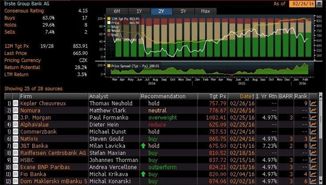 Akcie Erste Group Bank aktuálně podle agentury Bloomberg pokrývá 27 analytických týmů. Sedmnáct doporučení je na stupni "kupovat", osm "držet" a dvě "prodávat". Průměrná cílová cena analytiků je 853,91 Kč, ve čtvrtek akcie Erste na pražské burze uzavřely na 665,90 Kč. Růstový potenciál tak dosahuje více než 28 %.