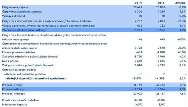 "Provozní výnosy se snížily v důsledku přetrvávajících nízkých tržních úrokových sazeb, kde ani zrychlený růst úvěrů nedokázal zvrátit negativní vývoj čistého úrokového výnosu," uvedla banka. Za růstem provozních nákladů byly mimo jiné investice do vývoje nových digitálních aplikací.