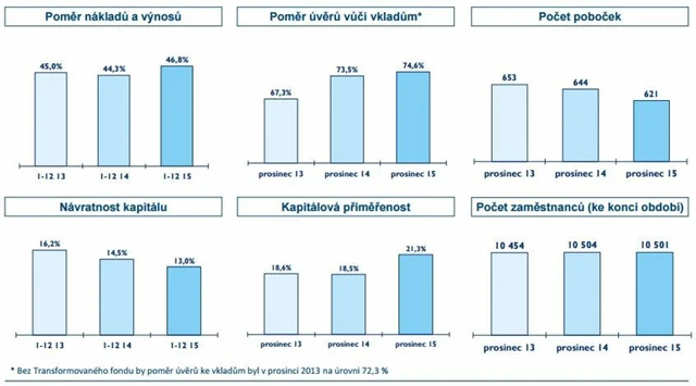Poměr úvěrů ke vkladům ve čtvrtém čtvrtletí meziročně klesl o dvě desetiny procentního bodu na 98,4 %, proti třetímu čtvrtletí se ale snížil z 99,3 %. Ukazatel kapitálové přiměřenosti CET 1 se loni meziročně zvýšil na 12,3 % z 10,6 %, ve třetím kvartálu loňského roku dosahoval 11,5 %.