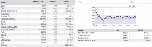 Za celý únor index PX ztratil 6,89 %. Nedařilo se akciím VIG, Erste, ČEZ ani Komerční banky, zhruba na svém zůstala O2, mírně pak posílily Philip Morris ČR nebo Unipetrol.