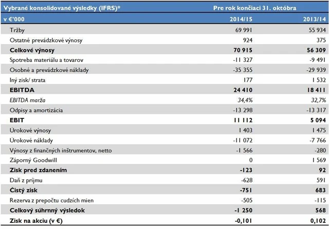Slovenskému správci sportovních areálů Tatry Mountain Resorts se ve finančním roce 2014/2015 zvýšily celkové výnosy meziročně o 29 % na 70,9 milionu eur.