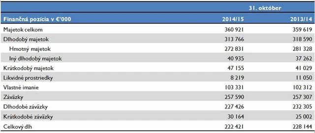 Celková zadluženost společnosti k 31. říjnu 2015 dosahovala 222,4 milionu eur a účetní hodnota majetku byla 360,9 milionu eur.